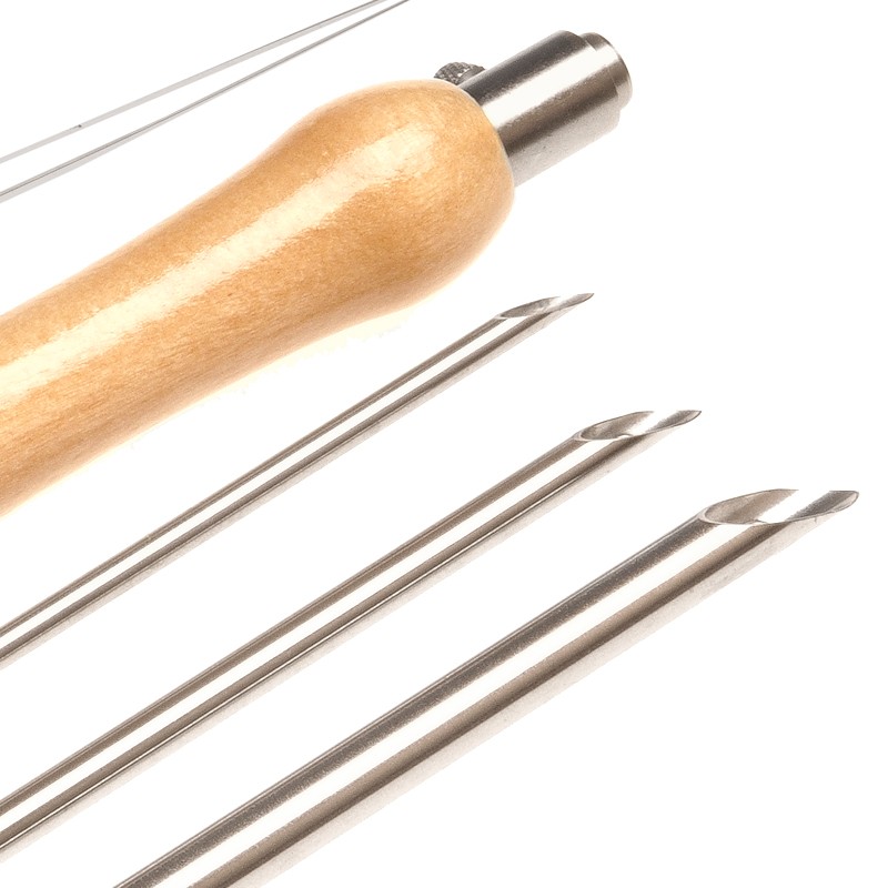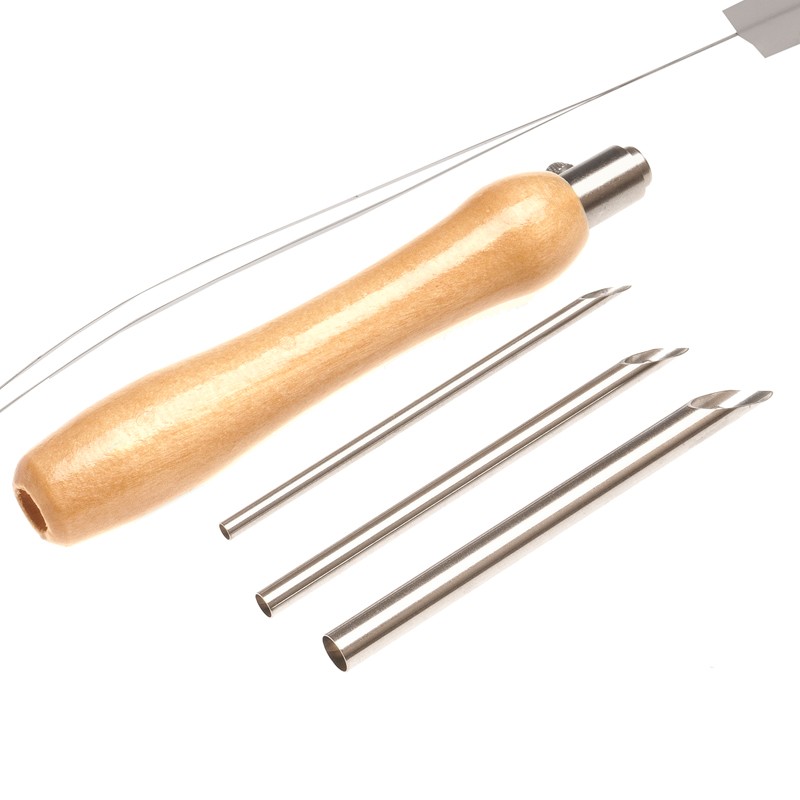 Opakowanie: drewniana rączka, 3 wymienne metalowe igły, żyłka do nawlekania